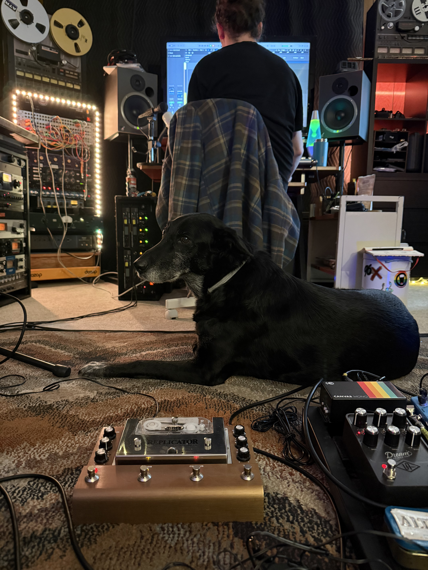 For leads we armed ourselves with the trusty JCM for amp driven crunch. Drew had a ton of cool tools, so we leveraged an EBow as well as a tape echo to create some eerie melodic lines and hazy clouds of delay. Our trusty A&R Miles was laid out in front of our pedalboards chewing on a toy frequently during the session.